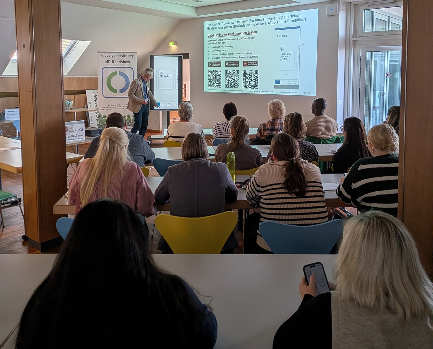 Ein Highlight der eID-Roadshow war der digitale Fahrzeugschein, welcher in die neue i-Kfz-App geholt werden kann ( Bericht hierzu in der Tagesschau am 6. November 2025: Den Fahrzeugschein gibt es jetzt auch fürs Handy ). Der digitale Fahrzeugschein wurde zusammen mit der zugehörigen i-Kfz-App am 6. November von Bundesdigitalminister Dr. Wildberger und weiterer Personen der Öffentlichkeit vorgestellt ( Vorstellung digitaler Fahrzeugschein und i-Kfz-App ). buergerservice.org hat dieses Angebot aktiv in die eID-Roadshow integriert. So konnten viele Teilnehmerinnen und Teilnehmer noch während der eID-Roadshow ihren digitalen Fahrzeugschein mit ihrem neu erlangten Wissen zur eID in sekundenschnelle aufs eigene Smartphone holen.