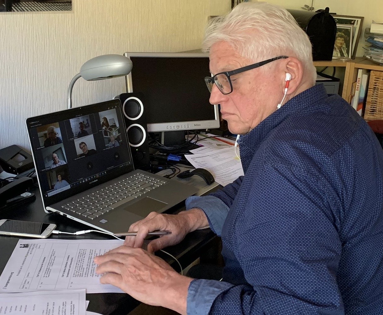 Ich schaue Günter Weick wieder mit dem entsprechenden Sicherheitsabstand über die Schulter und siehe da, es sind schon die ersten Teilnehmer in kleinen Fenstern auf dem Monitor zu sehen. In der Krisen-Situation ist insbesondere der öffentliche Bereich gefordert und somit haben jetzt die Mitarbeiter/innen wegen Corona alle Hände voll zu tun, so sind die Prioritäten auch gesetzt. Deshalb ist die Konferenz logischerweise auch nicht so stark mit Mitgliedern vertreten als es sonst der Fall ist, aber immerhin haben sich 9 Personen in die Videokonferenz eingewählt, und zwar problemlos!