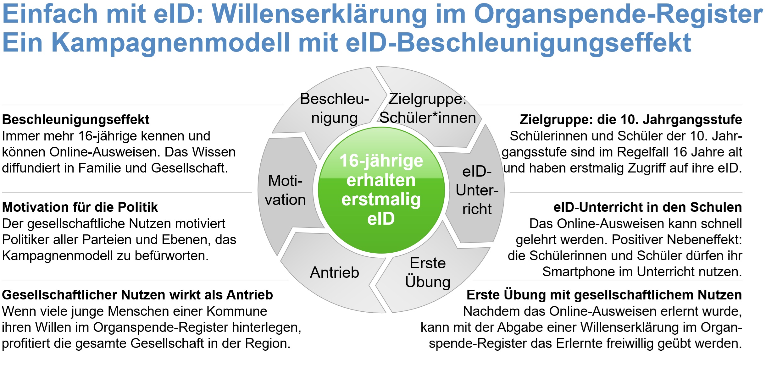 Das Kampagnenmodell beschreibt die Verbreitung von Akzeptanz und Nutzung der eID über eine Unterrichtsstunde in den 10.Jahrgangsstufen von Schulen. Im Rahmen der Unterrichtsstunde wird nicht nur der Umgang mit dem eigenen Online-Ausweis am eigenen Smartphone gelernt, sondern es wird auch als erste Übung die Abgabe einer Willenserklärung im Organspende-Register gezeigt und zum Mitmachen eingeladen. Der damit einhergehende große gesellschaftliche Nutzen kann dieses Kampagnenmodell zur Verbreitung von Wissen zur eID beschleunigen und ausbreiten.